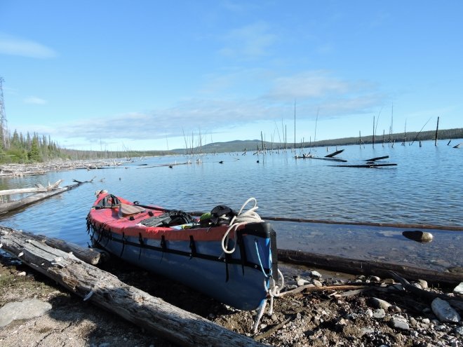 In fact it is also important to note that most of the water around this circuit exists because of the Kenney Dam. So much of the shorelines along these lakes have dead forests in the water and make it difficult to approach the shores. We also had to watch carefully, while paddling in these areas, to not to collide into dead heads just slightly under the water.
